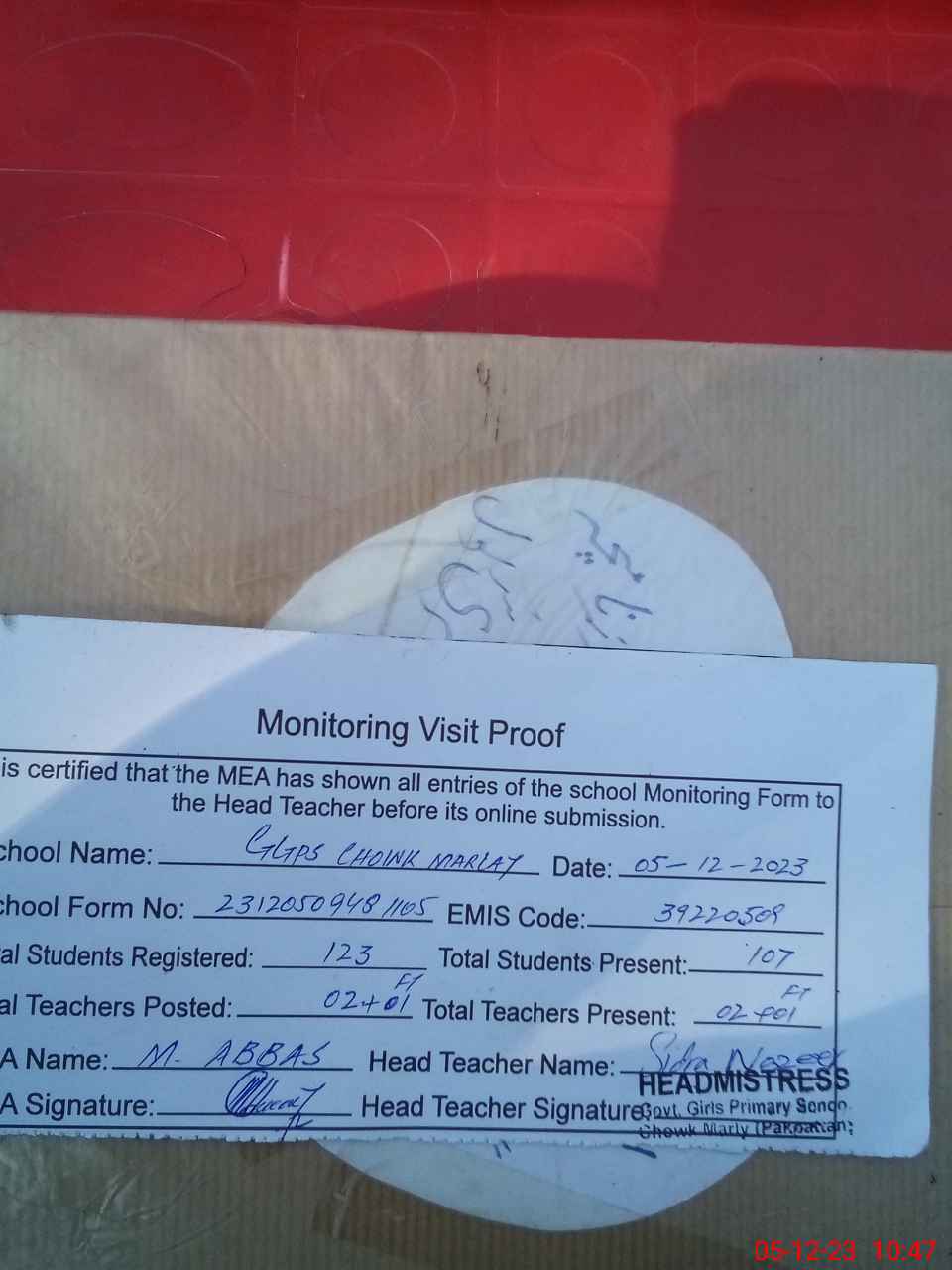 | EMIS Code: 39220509 | Name of School: GGPS CHOWK MARLAY | |||