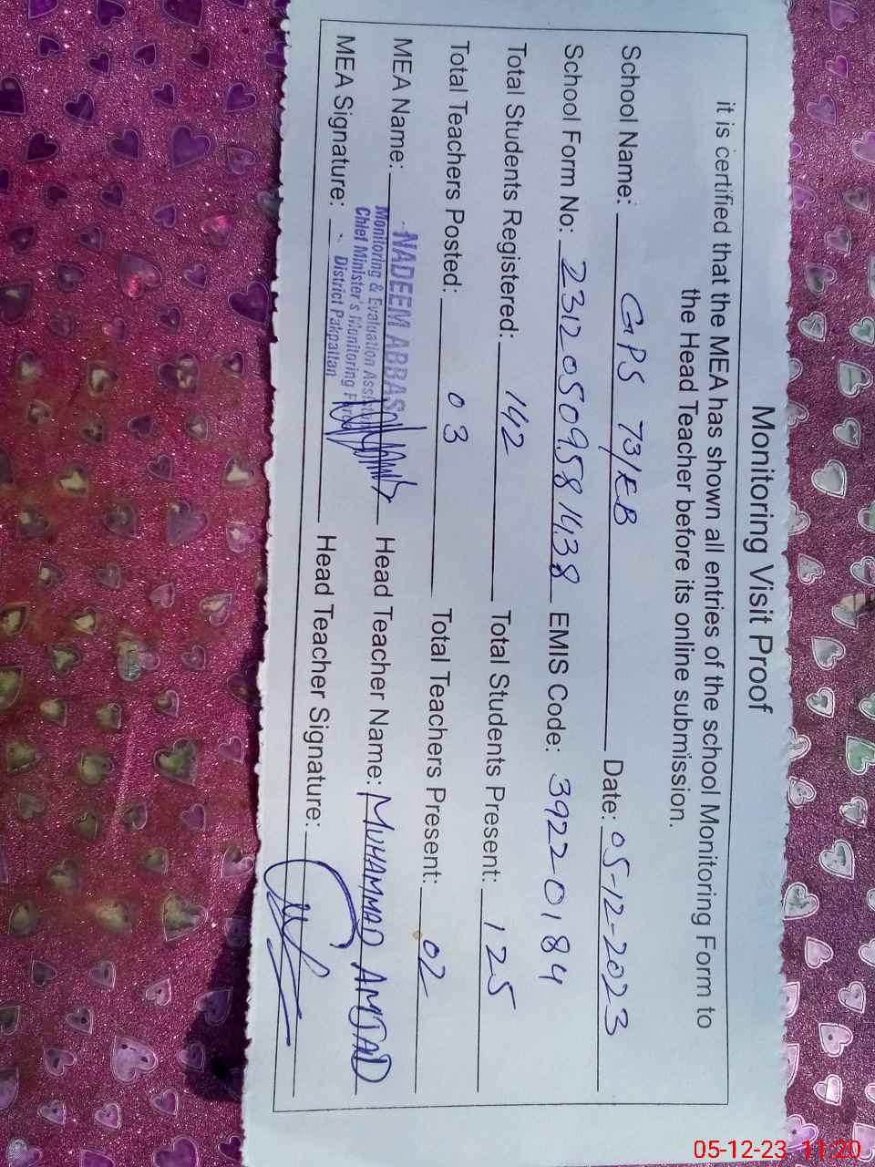 | EMIS Code: 39220184 | Name of School: GPS 73 EB P/O CHAK NO 75/EB | |||