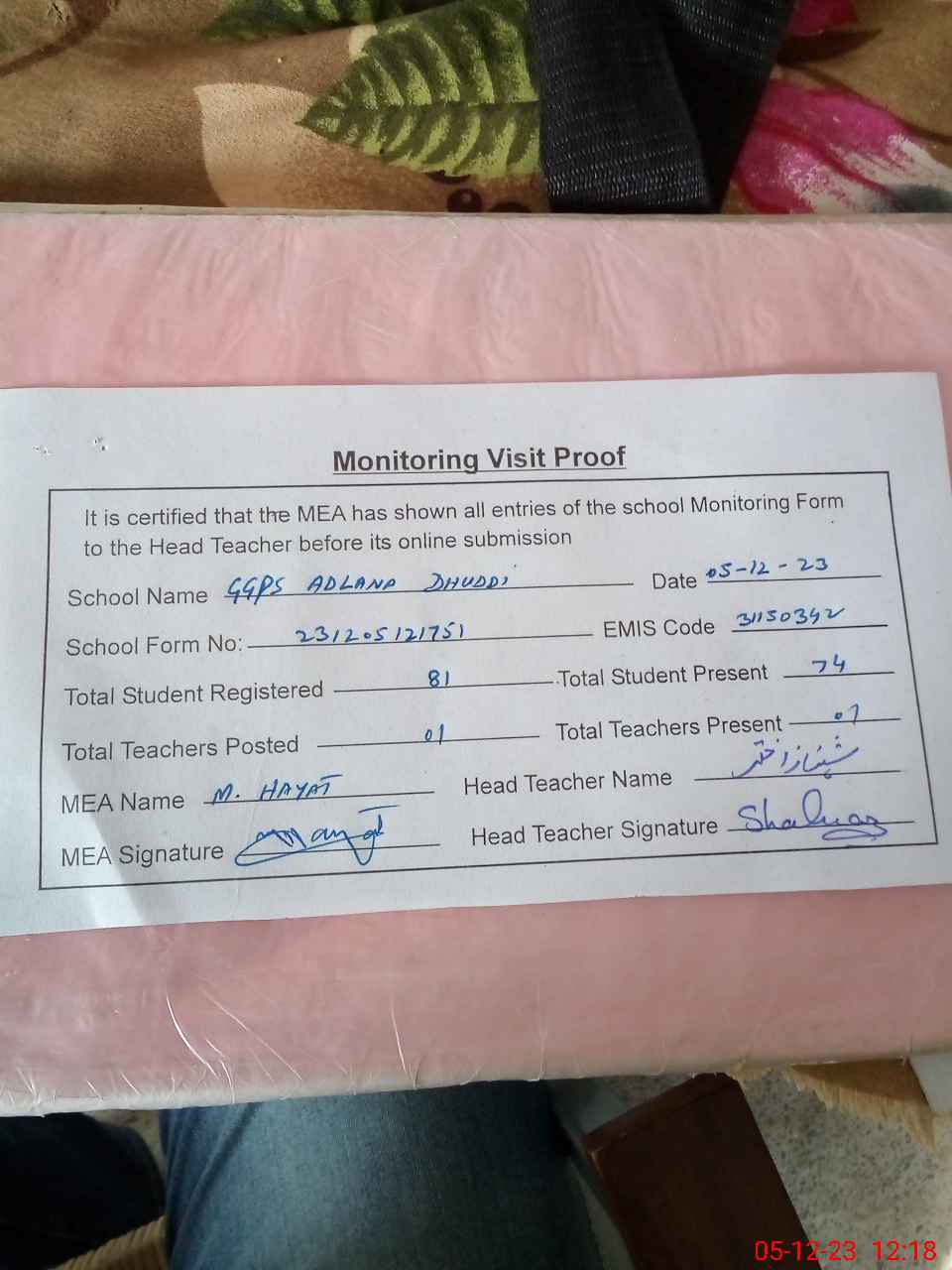 | EMIS Code: 31150342 | Name of School: GGPS ADLANA DHUDDI | |||