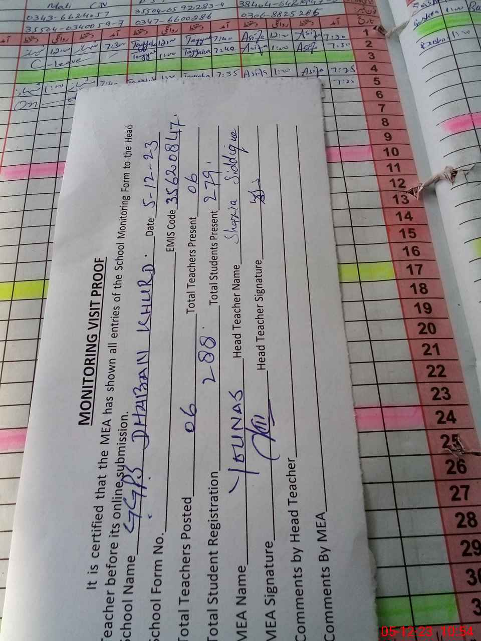 | Attendance Register | Head Teacher | MEA with School | Visit Proof |