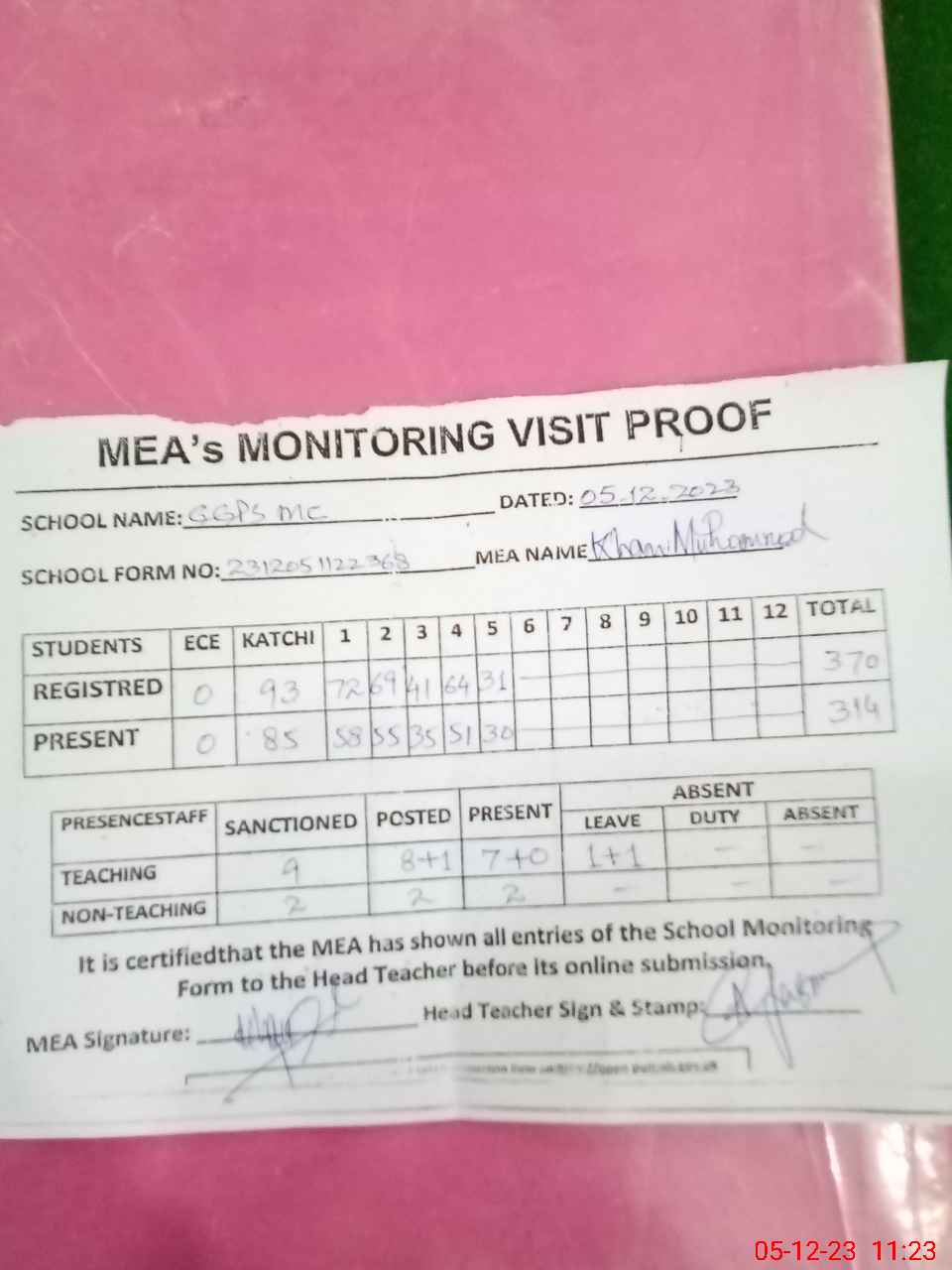 | Attendance Register | Head Teacher | MEA with School | Visit Proof |