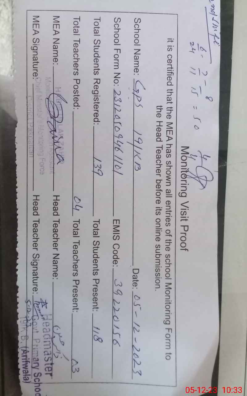 | EMIS Code: 39220156 | Name of School: GPS CHAK NO. 19 KB | |||