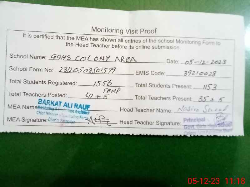 | EMIS Code: 39210028 | Name of School: GGHS COLONY AREA PAKPATTAN | |||