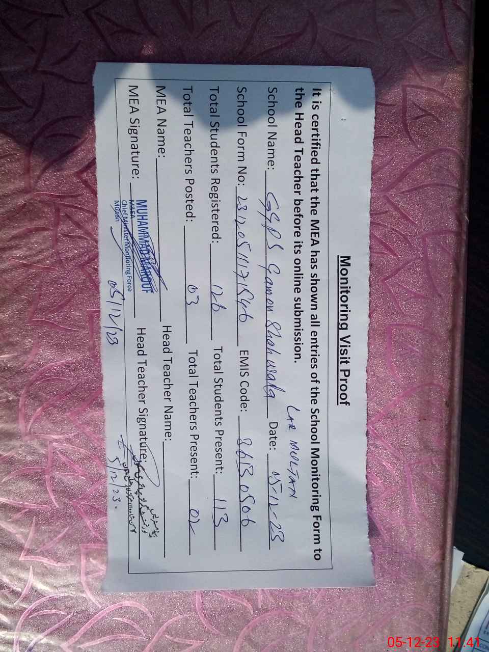 | EMIS Code: 36130506 | Name of School: GGPS GAMON SHAH WALA | |||