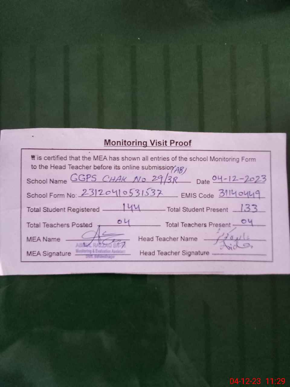 | EMIS Code: 31140449 | Name of School: GGPS CHAK 29/3-R (AB) | |||