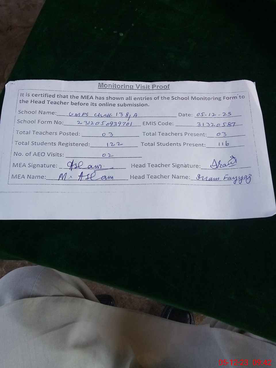 | EMIS Code: 31320587 | Name of School: GMPS CHAK NO.138/A | |||