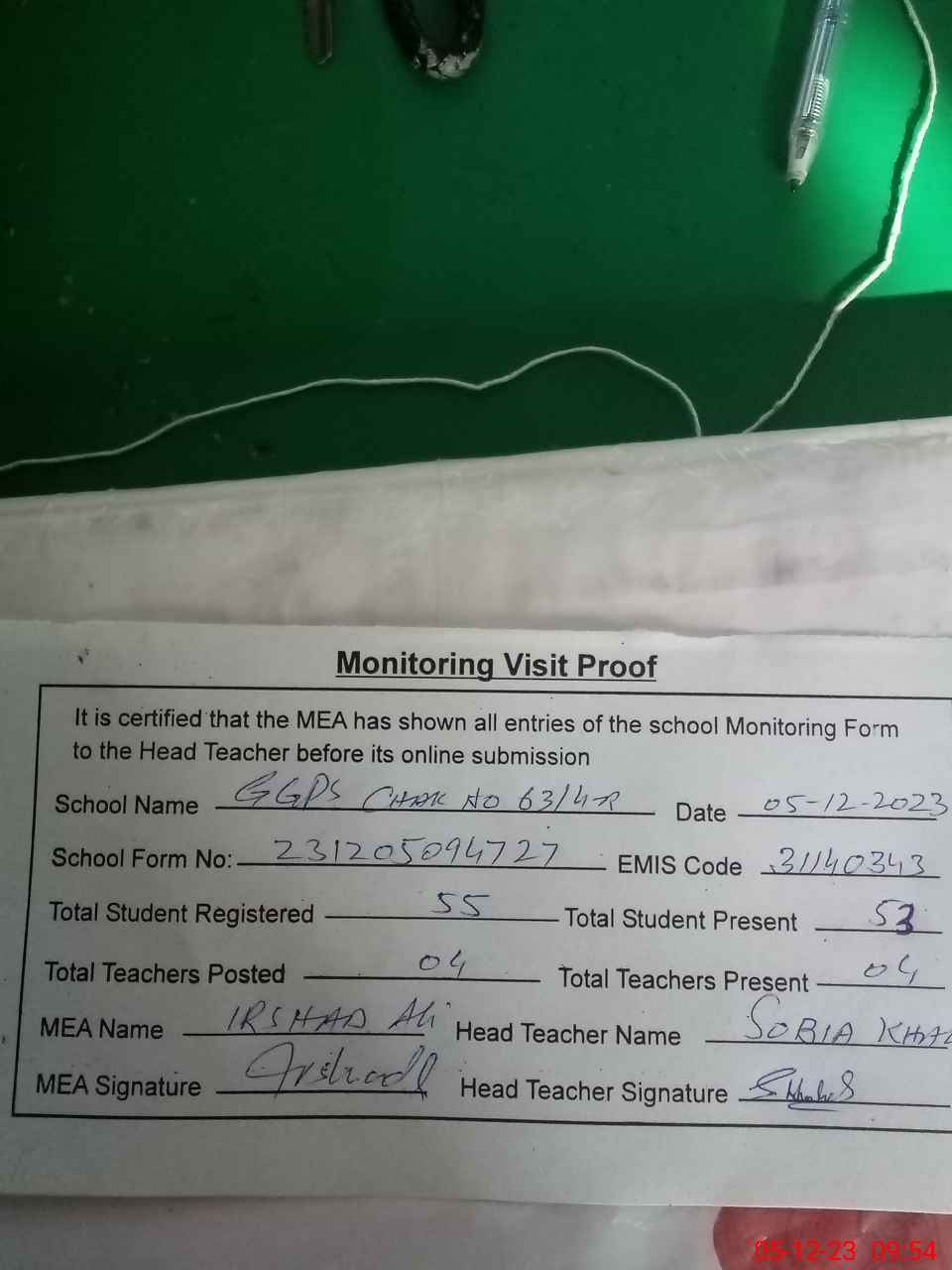 | Attendance Register | Head Teacher | MEA with School | Visit Proof |