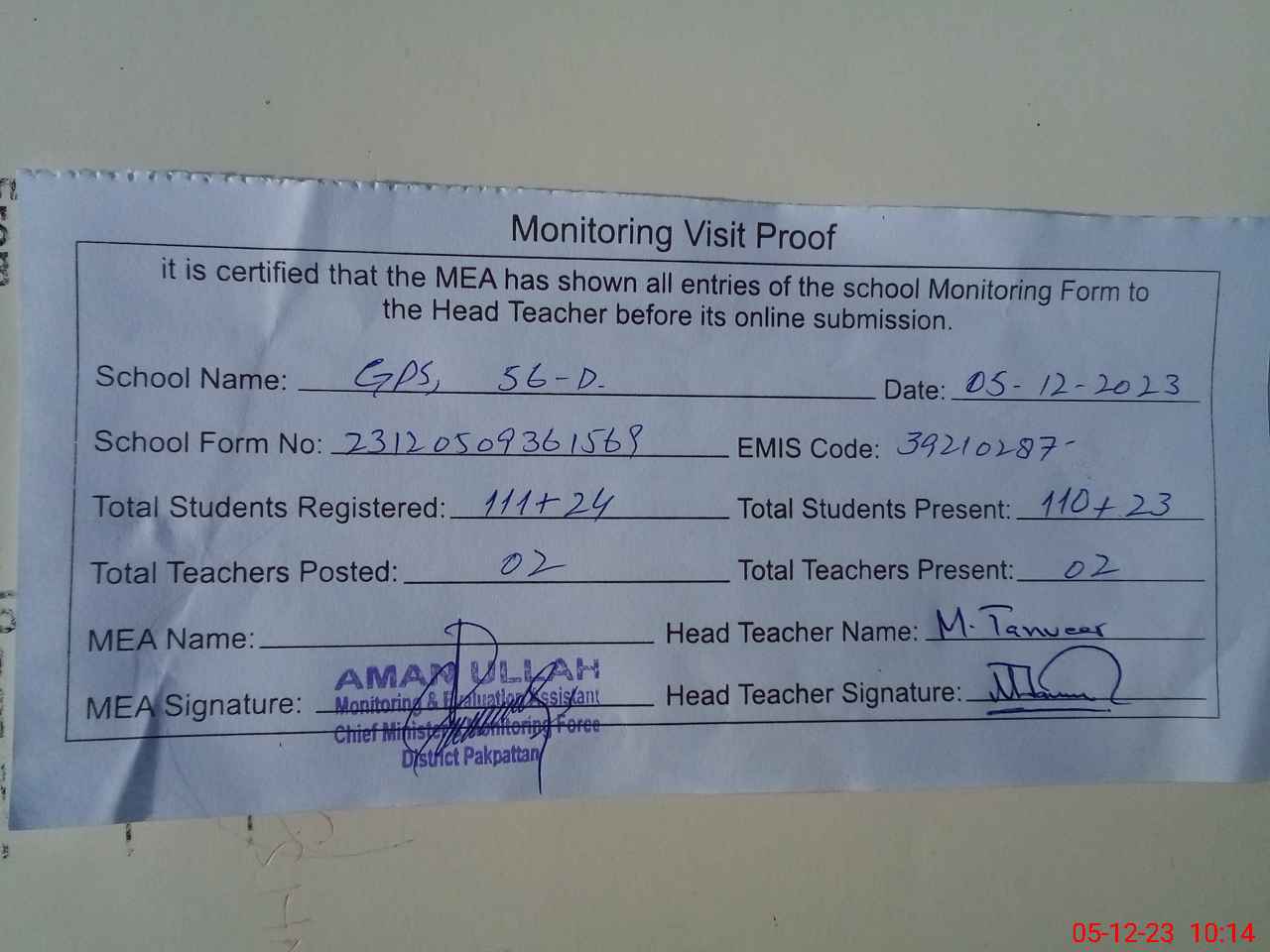 | Attendance Register | Head Teacher | MEA with School | Visit Proof |