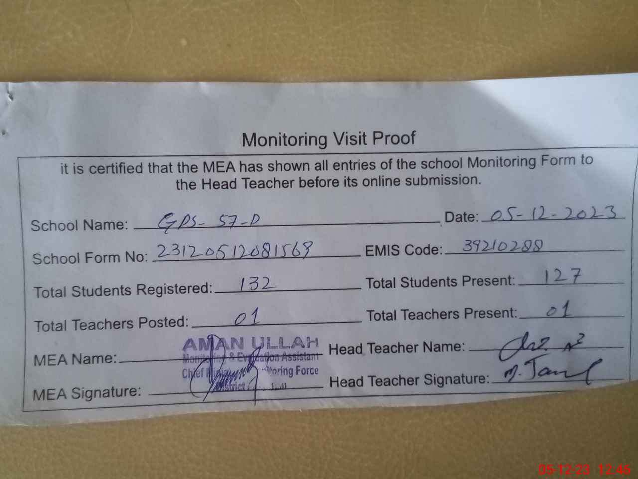 | Attendance Register | Head Teacher | MEA with School | Visit Proof |