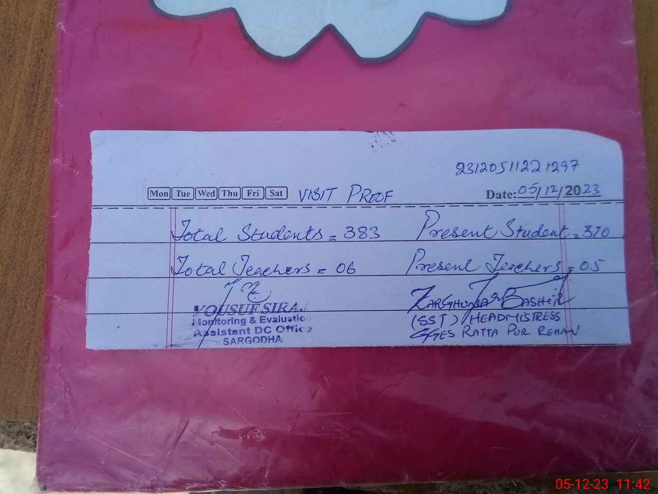 | Attendance Register | Head Teacher | MEA with School | Visit Proof |