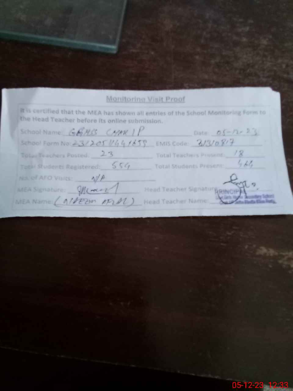 | Attendance Register | Head Teacher | MEA with School | Visit Proof |
