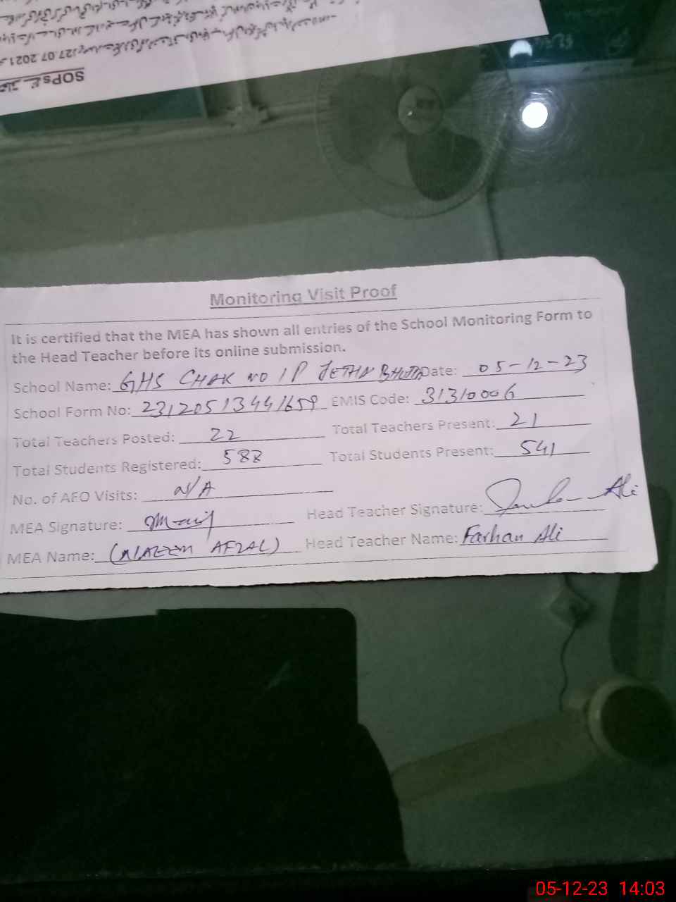 | Monitoring Date: 05-12-2023 | Start Time: 05-12-2023 12:41 PM | End Time: 05-12-2023 02:03 PM | Name of MEA: Na**** Af**** | |