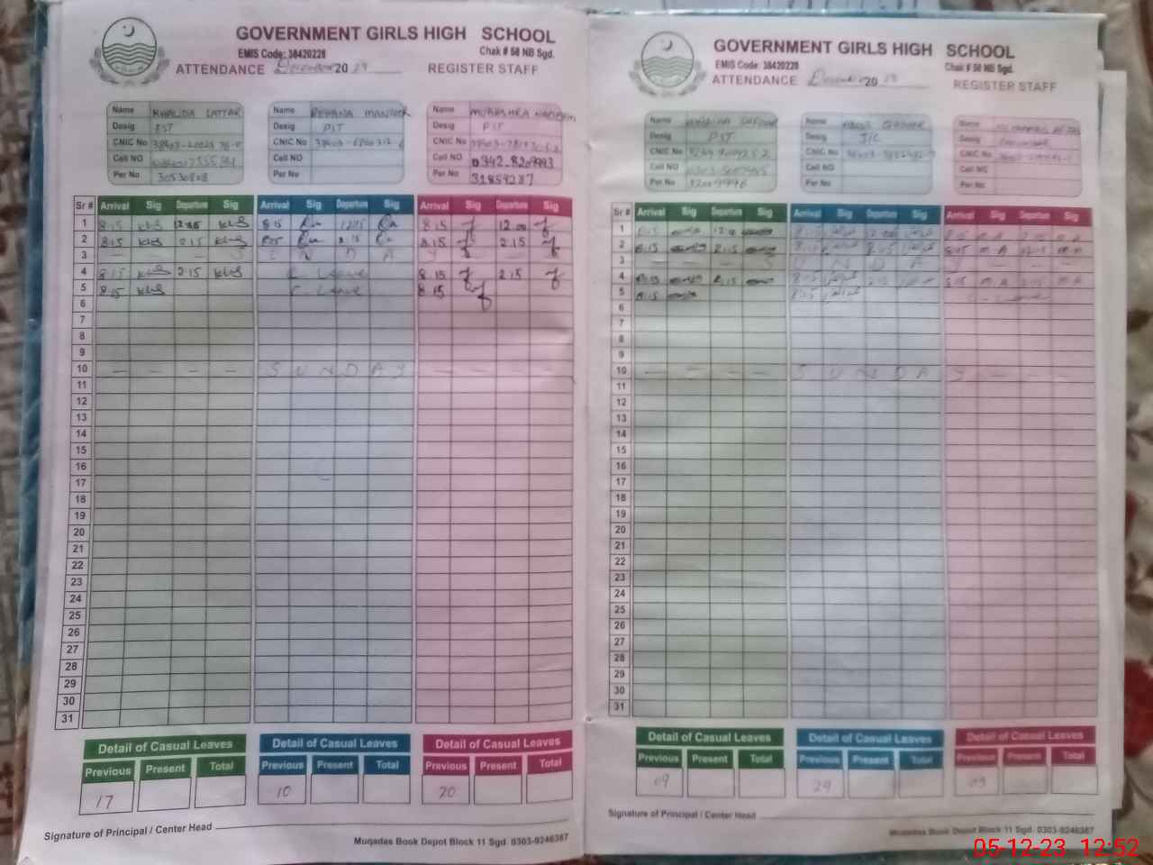 | CNIC | Full Name | Designation | R/C | Absence During Last Calender Month |