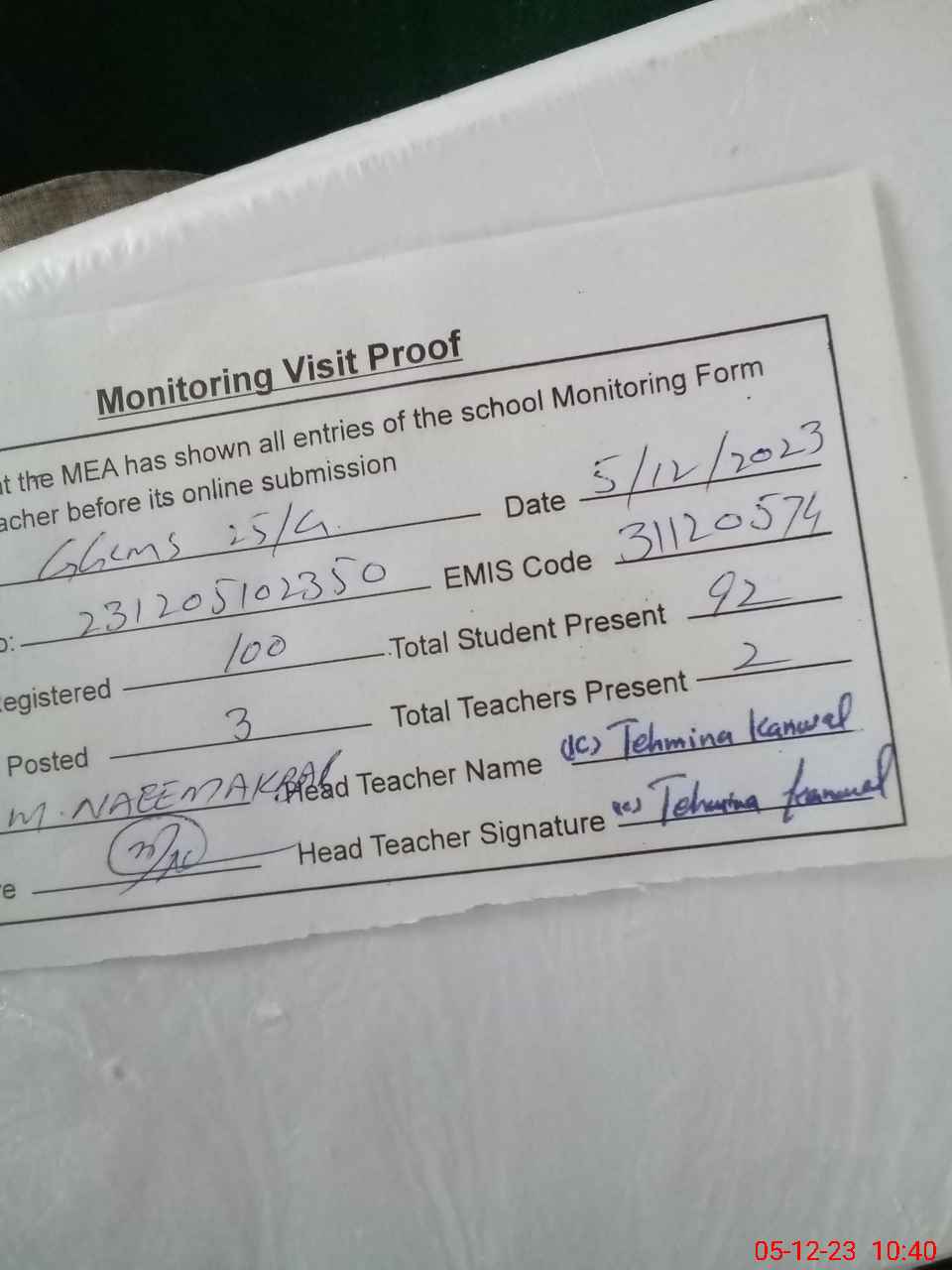 | Attendance Register | Head Teacher | MEA with School | Visit Proof |