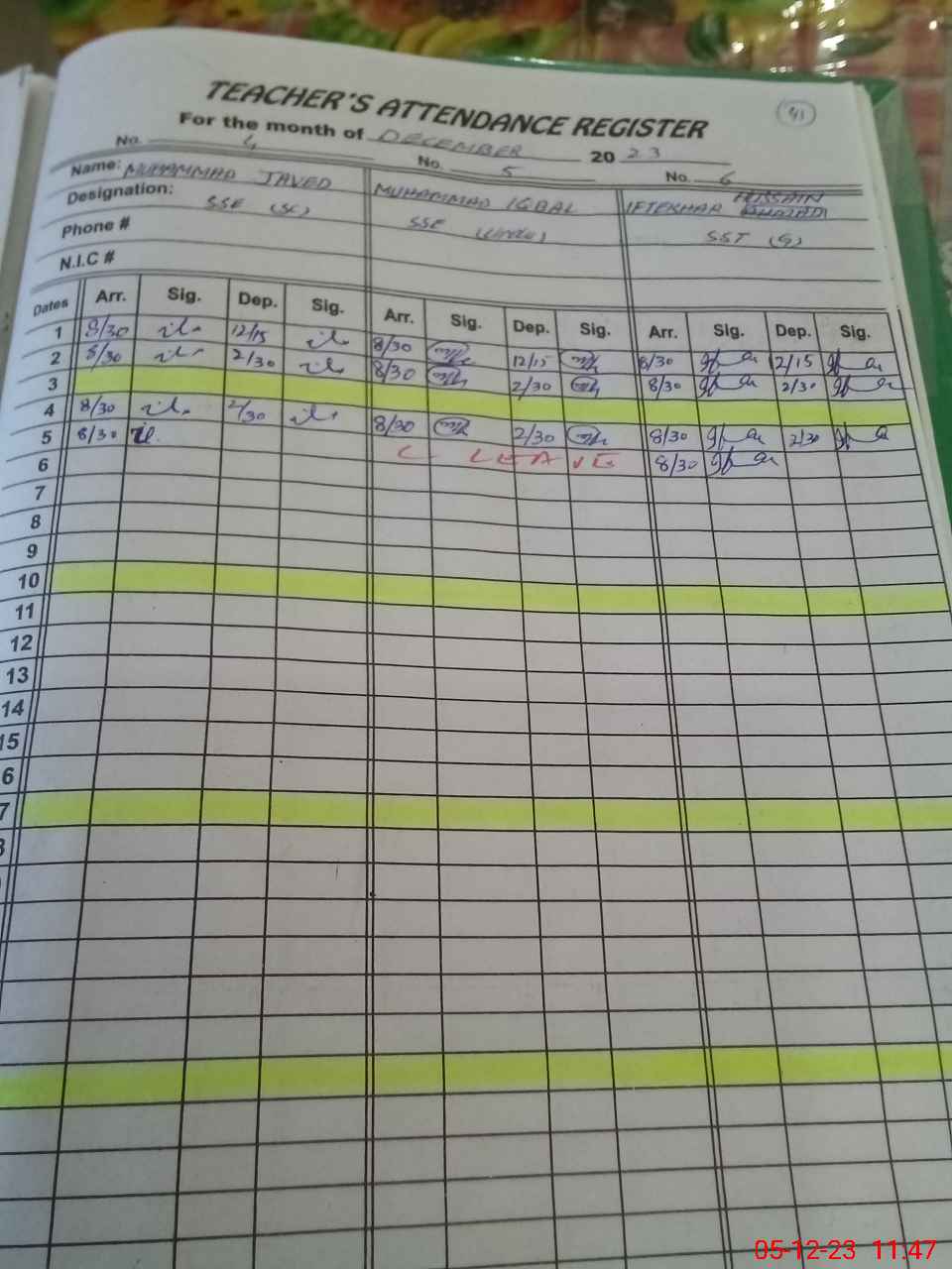| CNIC | Full Name | Designation | R/C | Absence during last cal. month |