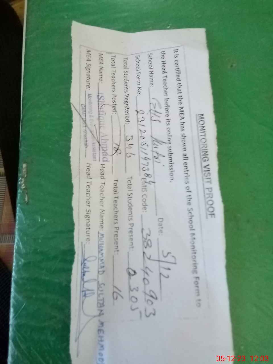 | Attendance Register | Head Teacher | MEA with School | Visit Proof |