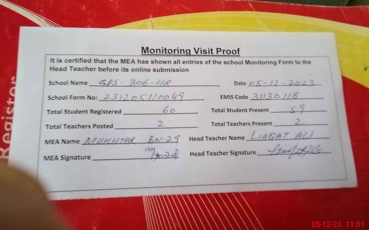 | Attendance Register | Head Teacher | MEA with School | Visit Proof |
