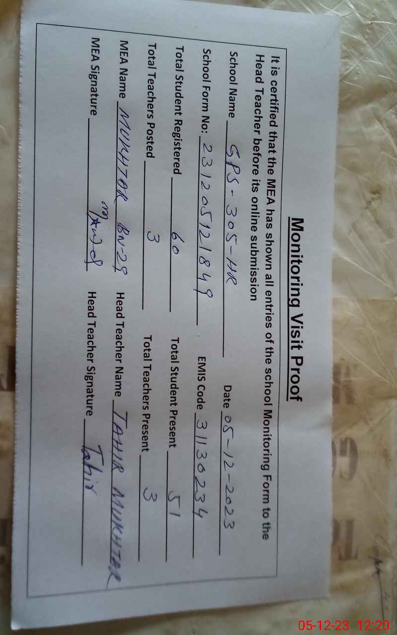 | EMIS Code: 31130234 | Name of School: GPS CHAK NO 305 HR | |||