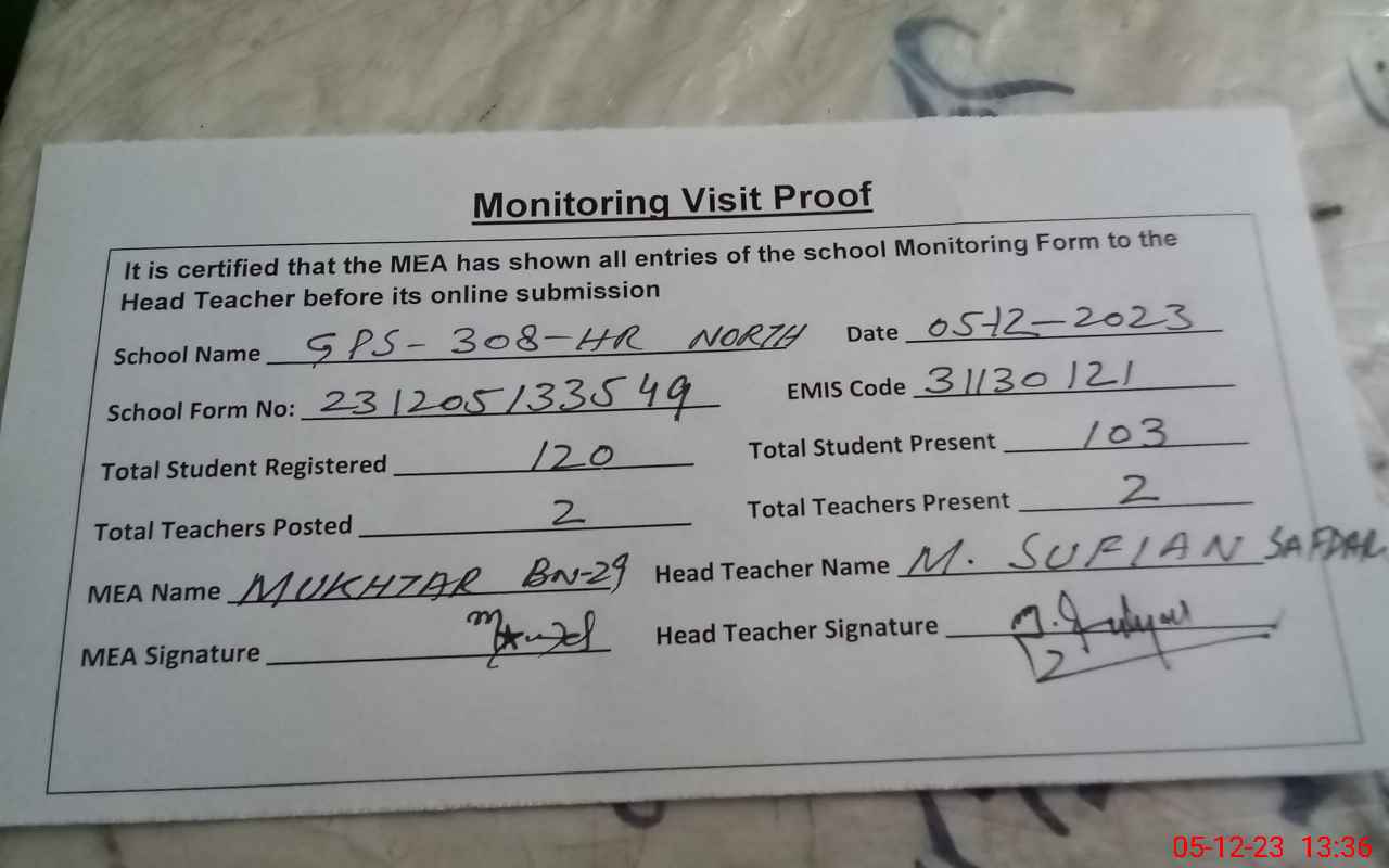 | EMIS Code: 31130121 | Name of School: GPS CHAK 308/HR NORTH | |||