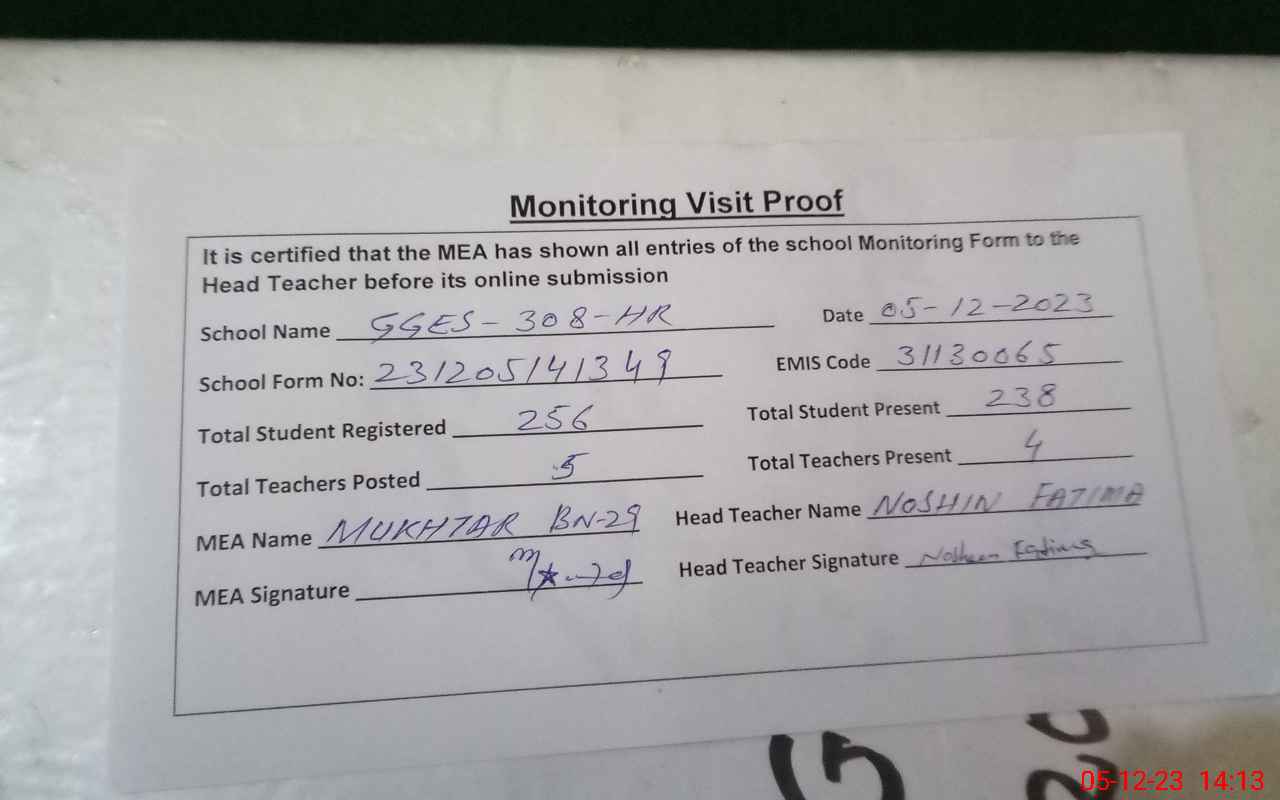 | EMIS Code: 31130065 | Name of School: GGES CHAK NO. 308 HR | |||