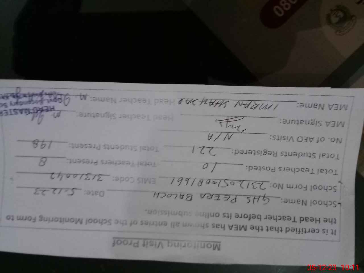 | Attendance Register | Head Teacher | MEA with School | Visit Proof |