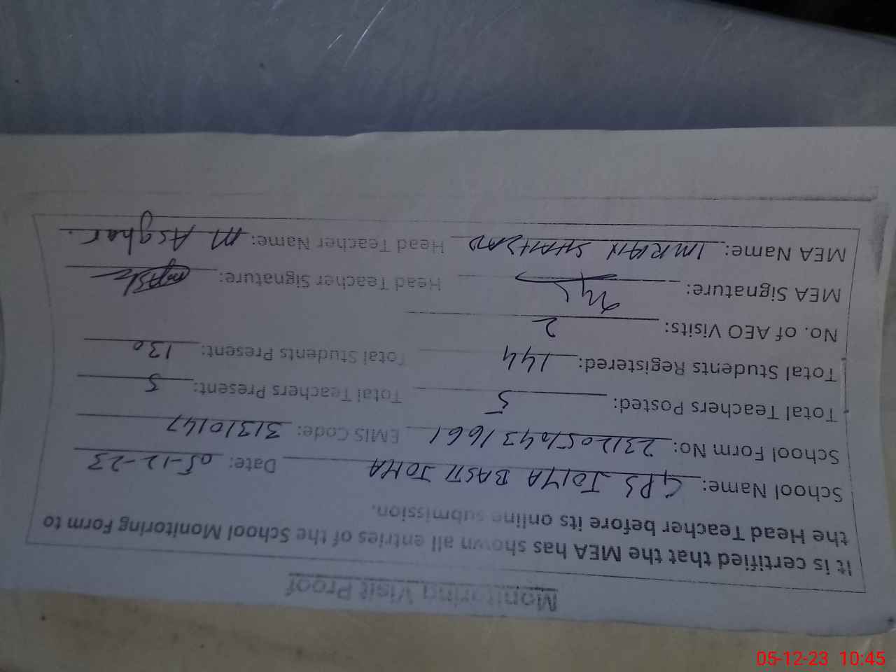 | Monitoring Date: 05-12-2023 | Start Time: 05-12-2023 10:27 AM | End Time: 05-12-2023 10:45 AM | Name of MEA: Im**** Sh**** | |