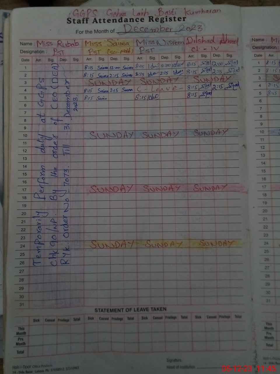 | CNIC | Full Name | Designation | R/C | Absence During Last Calender Month |