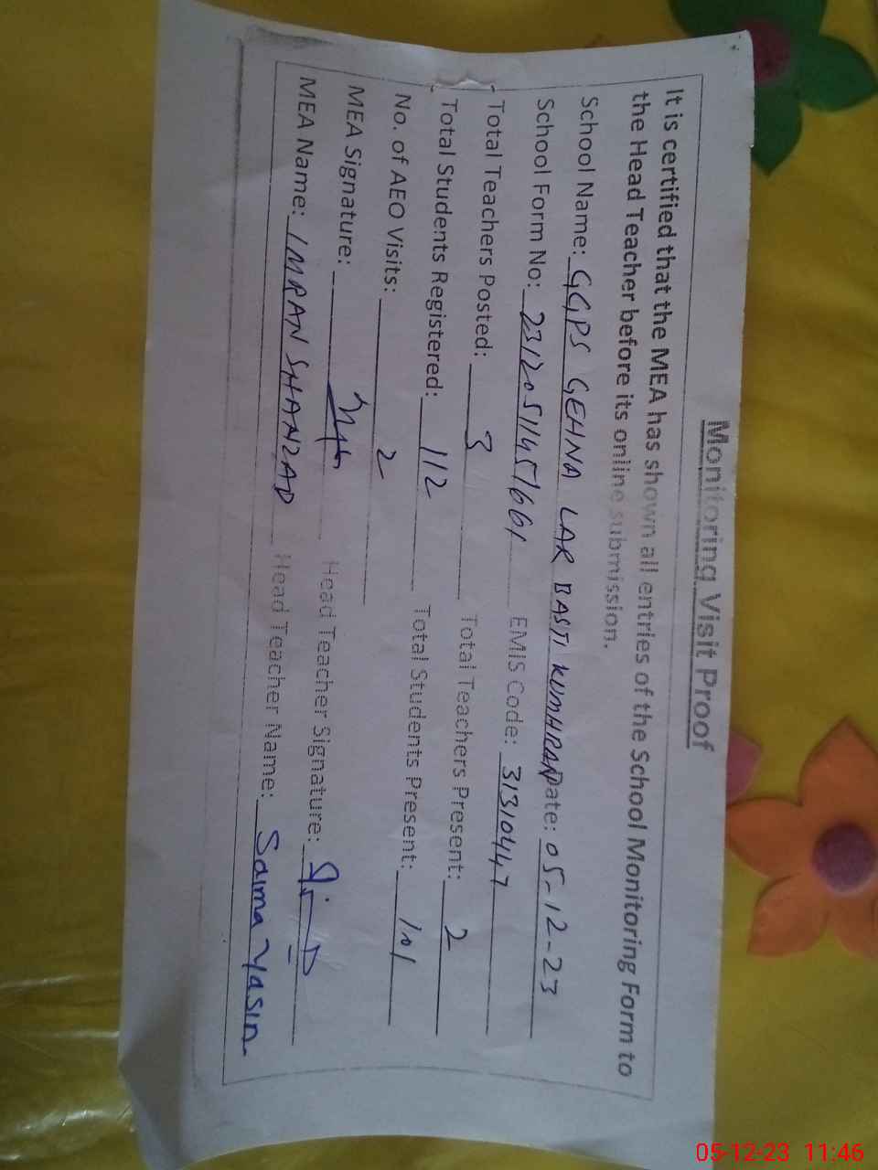 | Attendance Register | Head Teacher | MEA with School | Visit Proof |