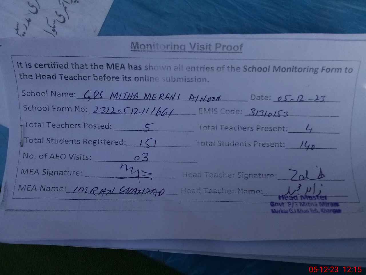 | EMIS Code: 31310153 | Name of School: GPS MITHA MERANI (After Noon) | |||