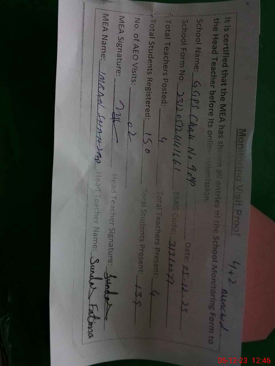 | Attendance Register | Head Teacher | MEA with School | Visit Proof |