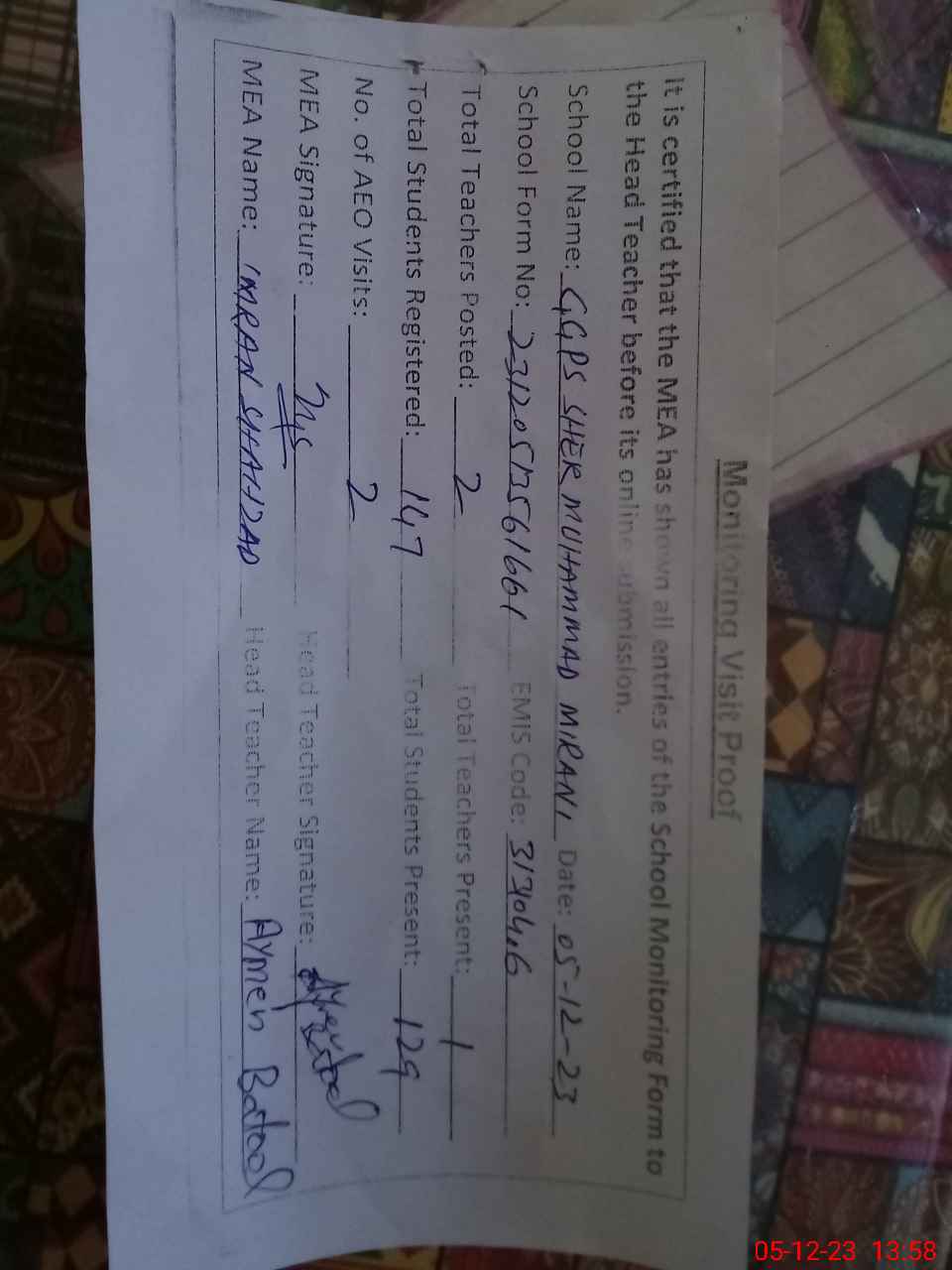 | Attendance Register | Head Teacher | MEA with School | Visit Proof |