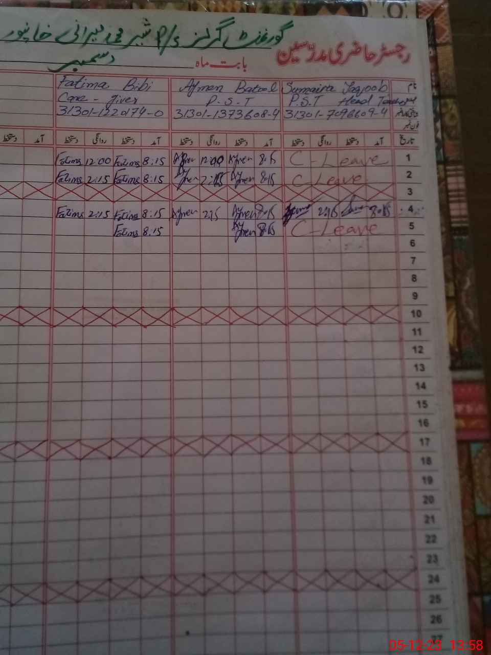 | CNIC | Full Name | Designation | R/C | Absence During Last Calender Month |