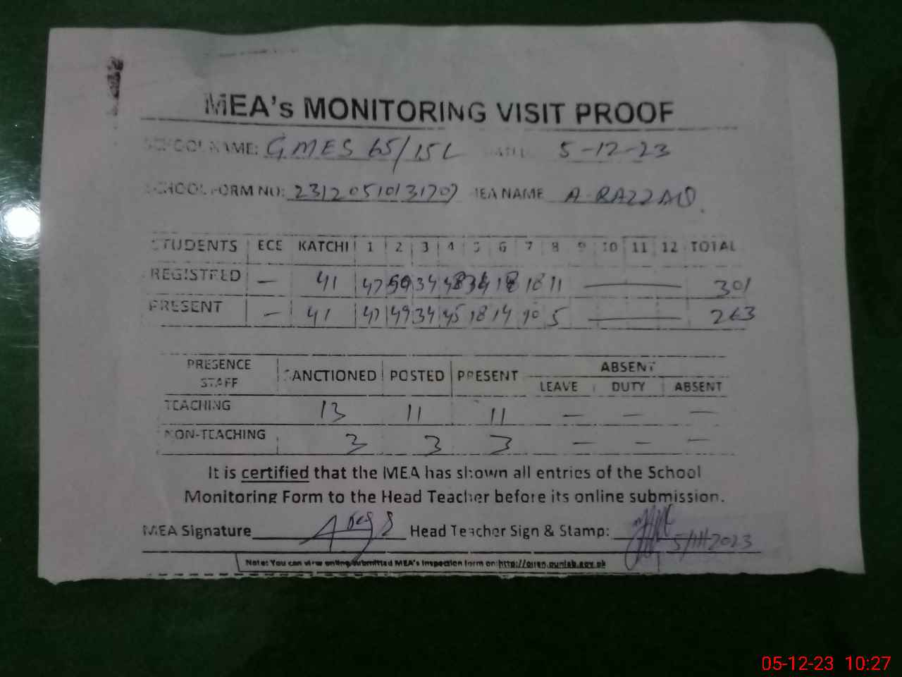 | Attendance Register | Head Teacher | MEA with School | Visit Proof |