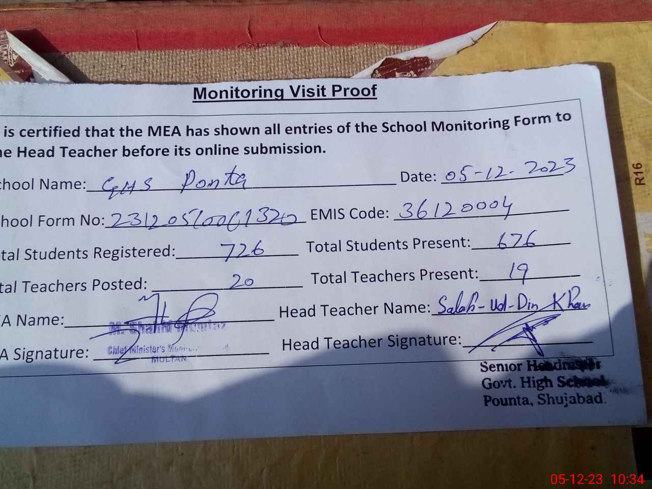| Attendance Register | Head Teacher | MEA with School | Visit Proof |