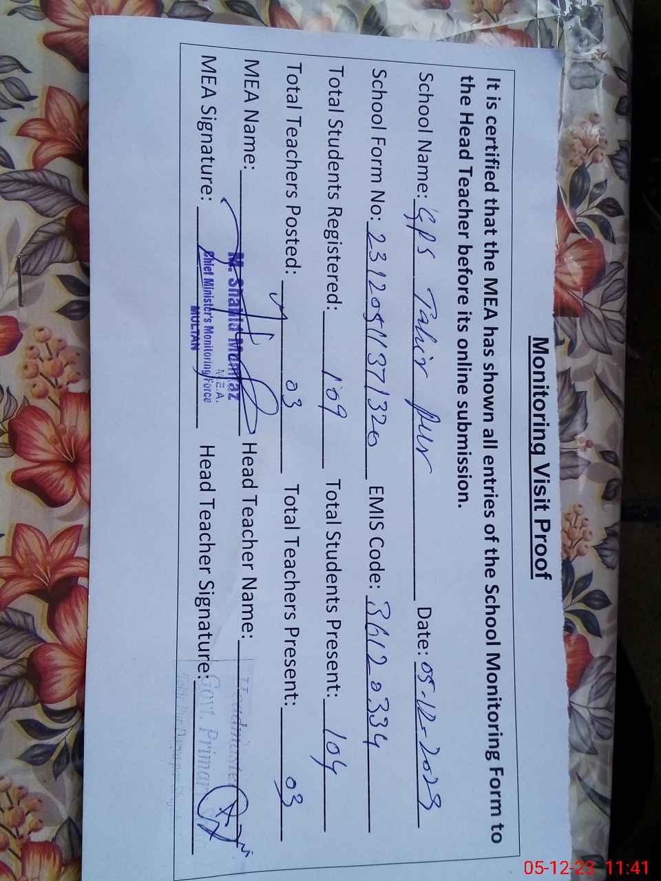 | EMIS Code: 36120334 | Name of School: GPS TAHIR PUR SHUJABAD | |||