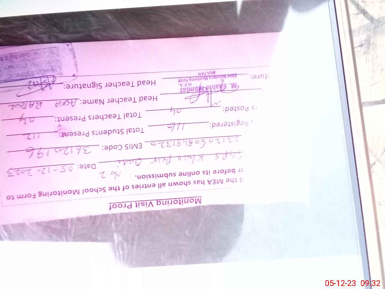 | Attendance Register | Head Teacher | MEA with School | Visit Proof |
