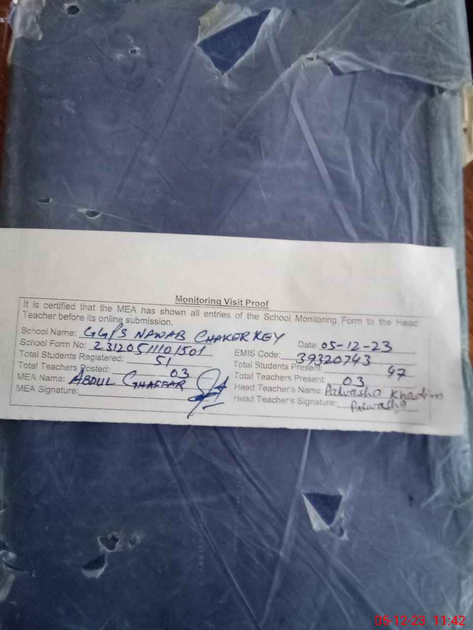 | Attendance Register | Head Teacher | MEA with School | Visit Proof |