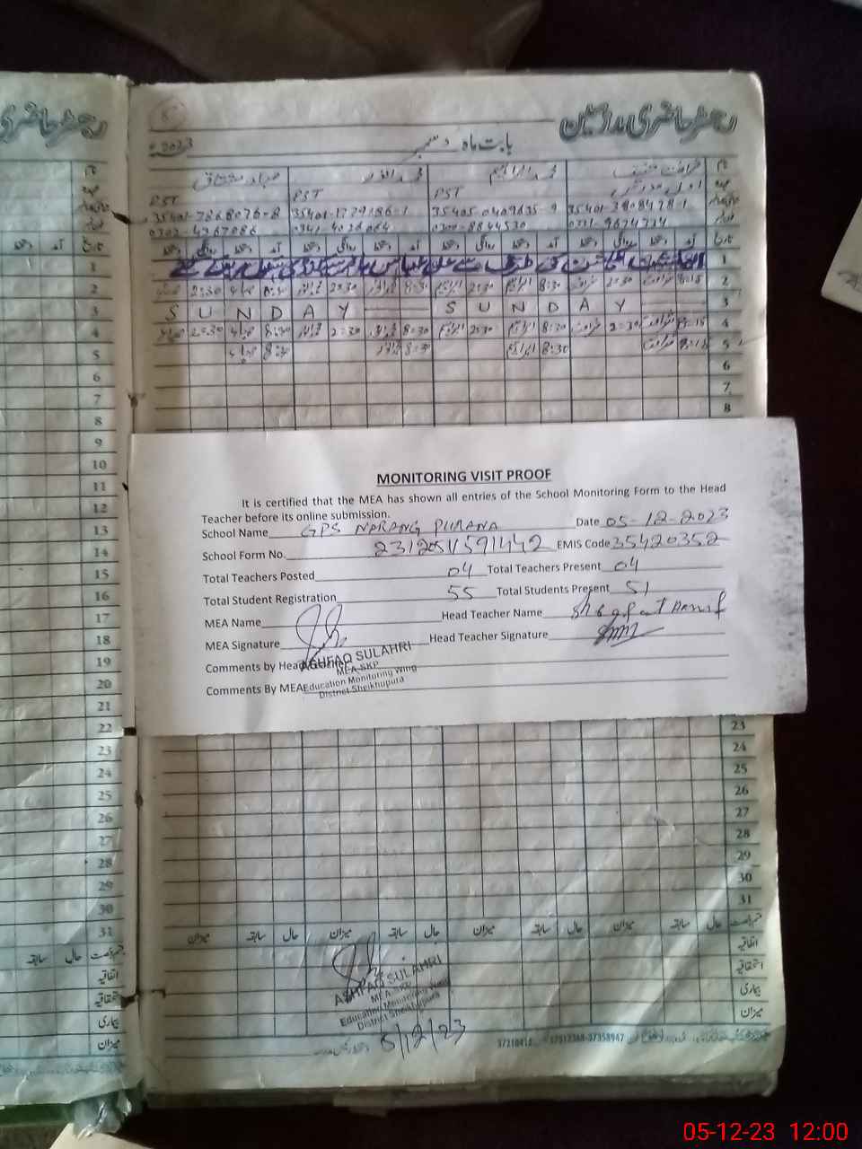 | Attendance Register | Head Teacher | MEA with School | Visit Proof |