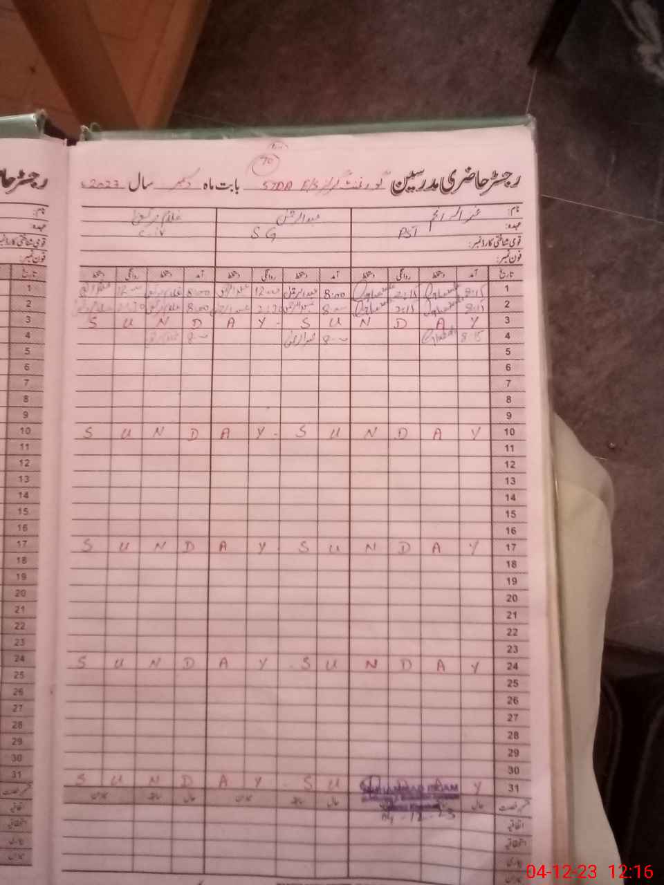 | CNIC | Full Name | Designation | R/C | Absence During Last Calender Month |