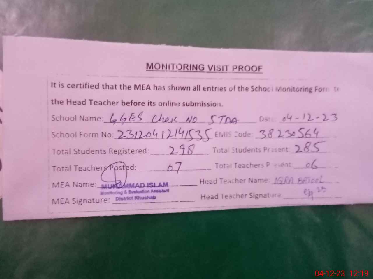 | Attendance Register | Head Teacher | MEA with School | Visit Proof |