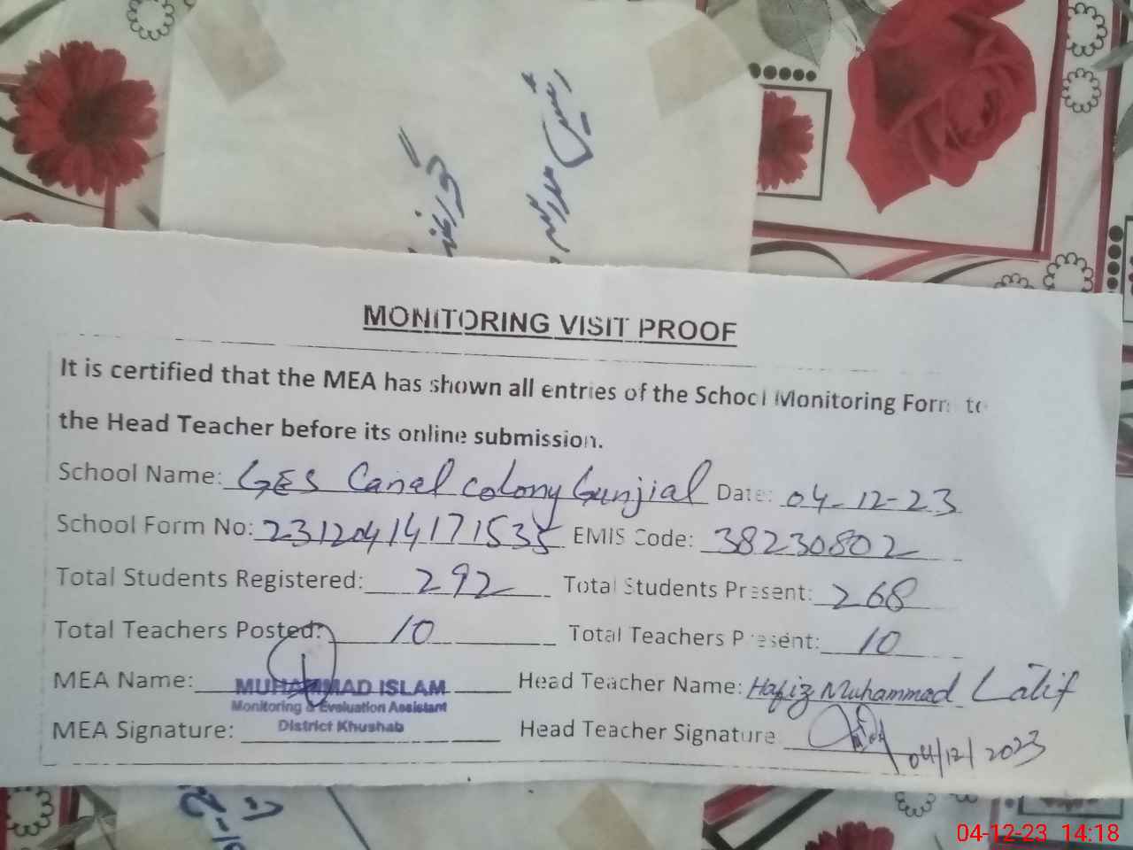 | EMIS Code: 38230802 | Name of School: GES CANAL COLONY GUNJIAL | |||