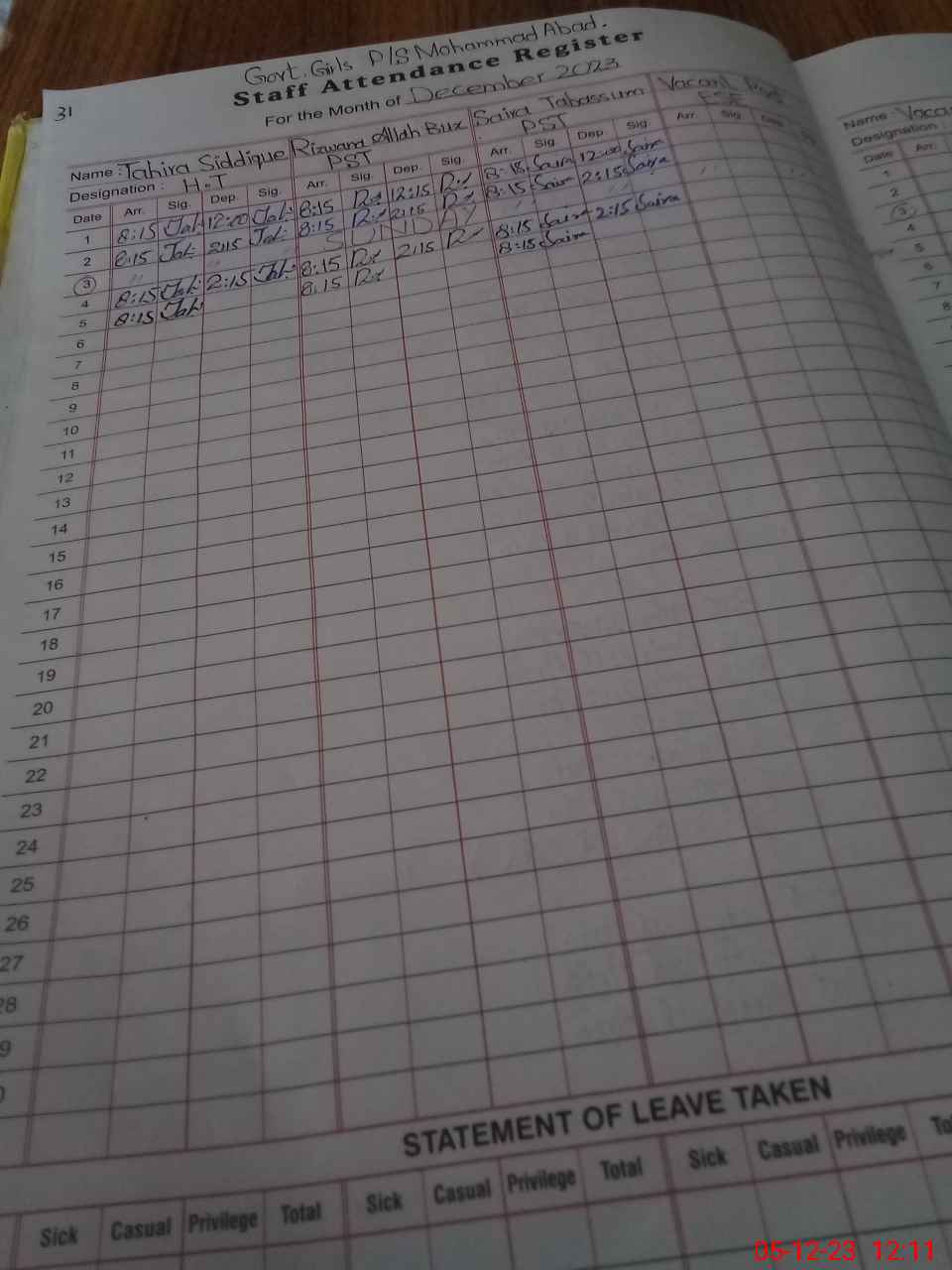 | CNIC | Full Name | Designation | R/C | Absence During Last Calender Month |