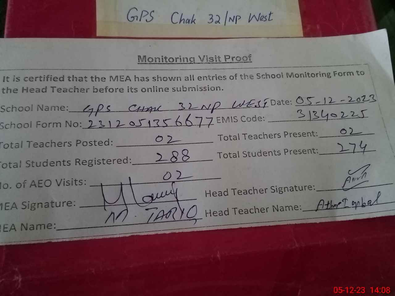 | EMIS Code: 31340225 | Name of School: GPS CHAK NO. 32 WEST | |||