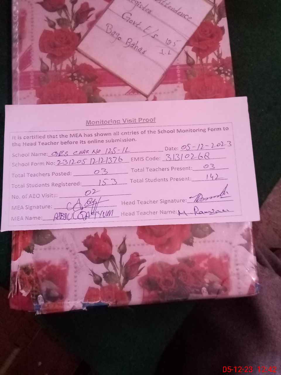 | Attendance Register | Head Teacher | MEA with School | Visit Proof |