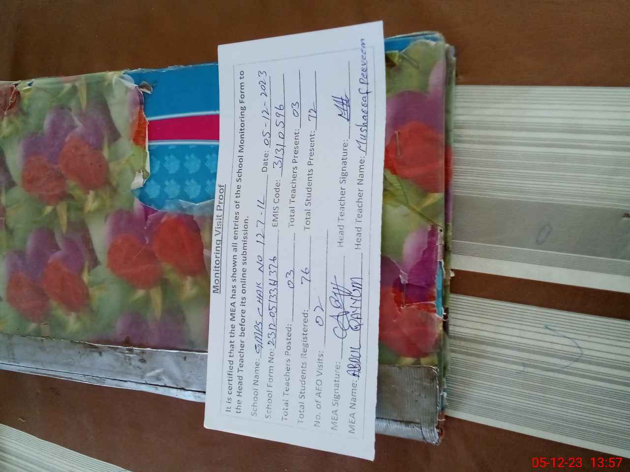 | Attendance Register | Head Teacher | MEA with School | Visit Proof |