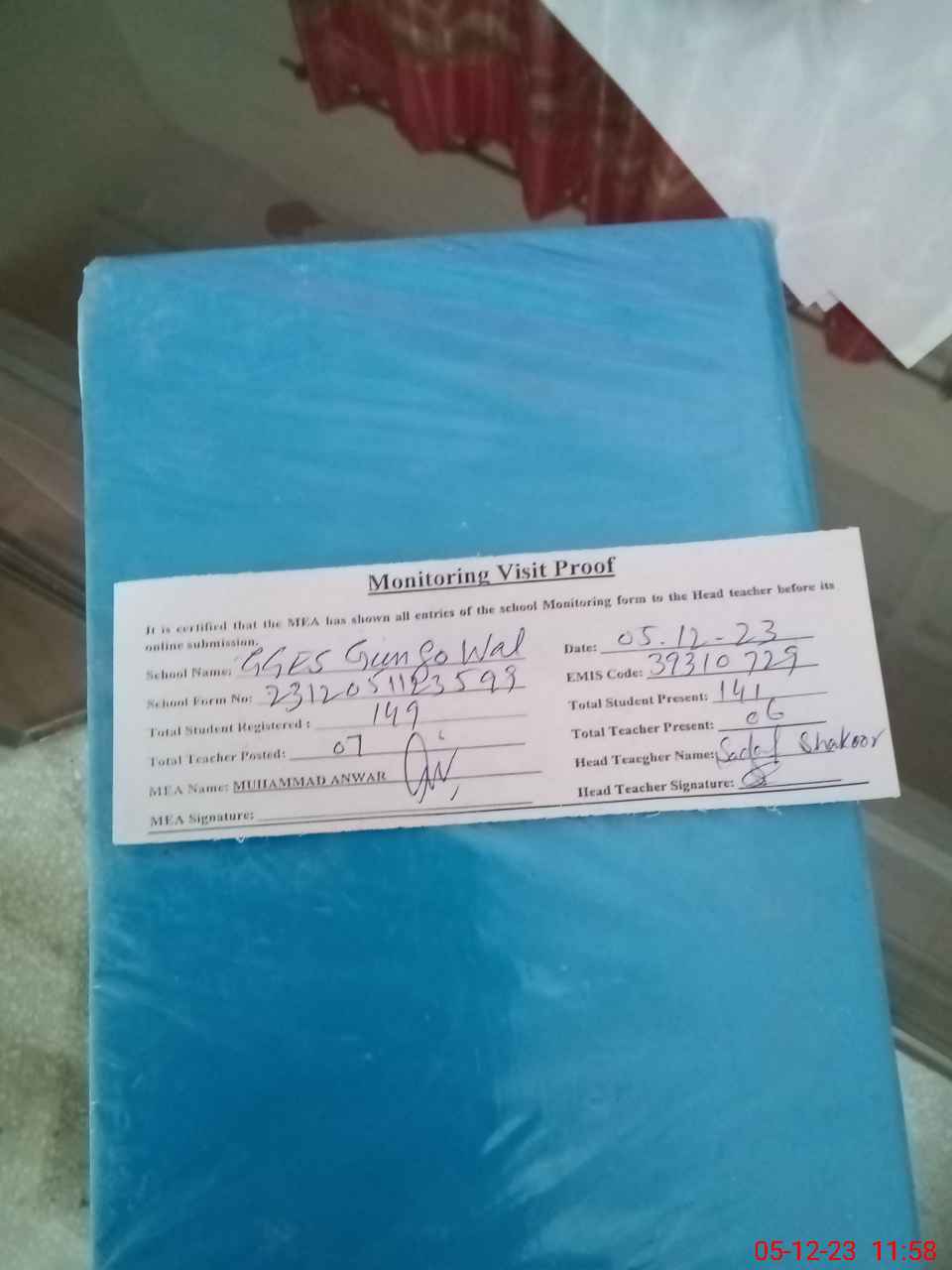 | Attendance Register | Head Teacher | MEA with School | Visit Proof |