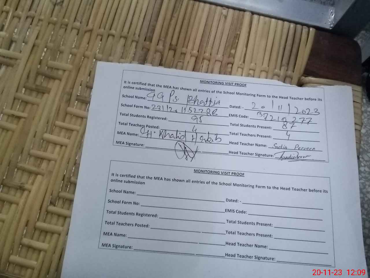 | Attendance Register | Head Teacher | MEA with School | Visit Proof |