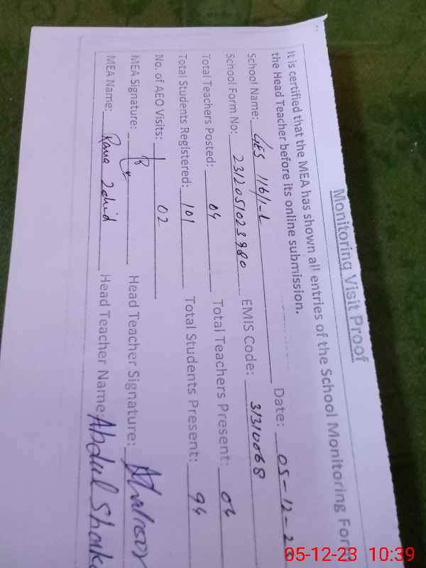 | Certified that this School was Inspected by the Undersigned MEA/DMO Today and the Information Stated Above is as Per Record. | |||||