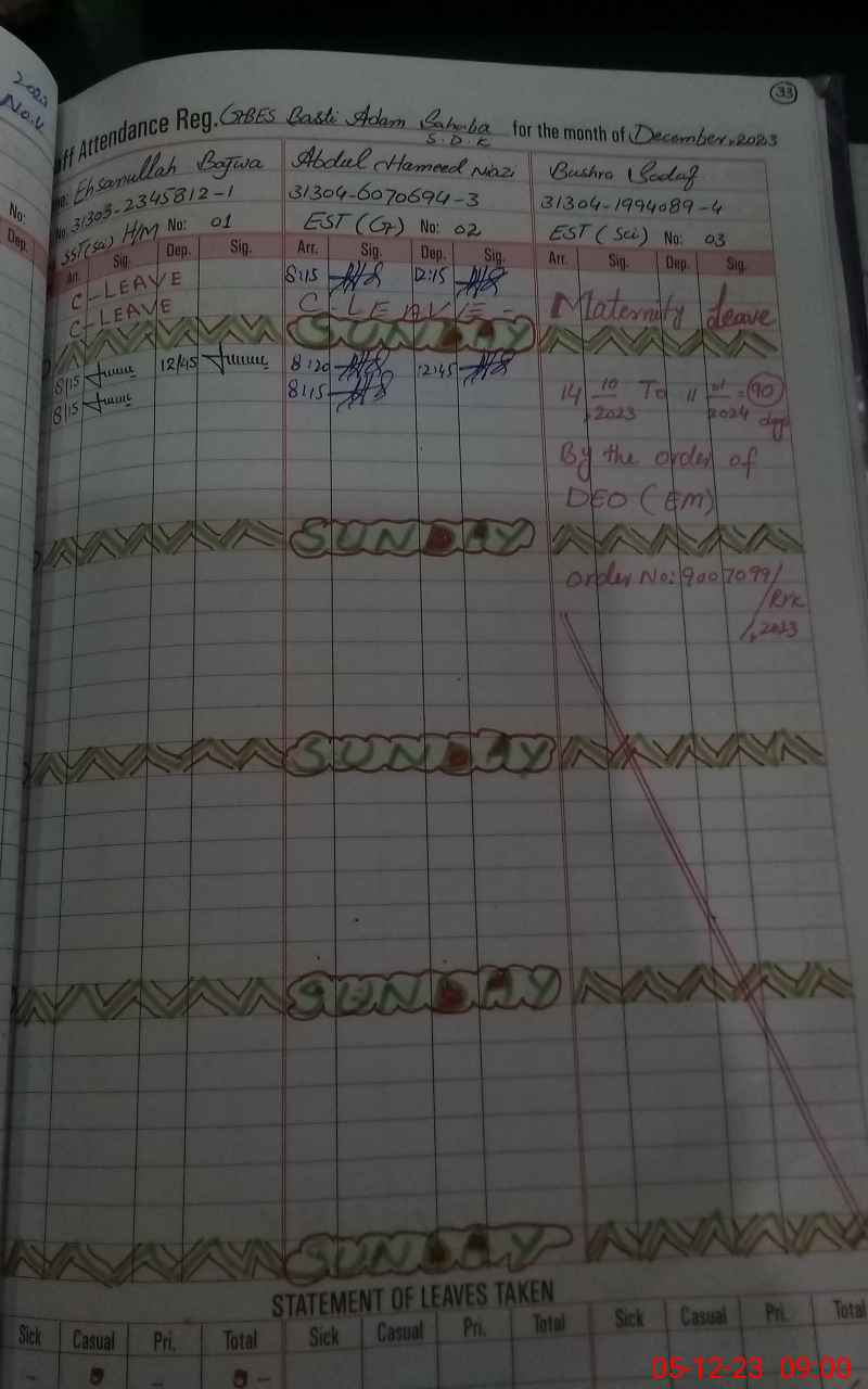 | CNIC | Full Name | Designation | R/C | Absence During Last Calender Month |