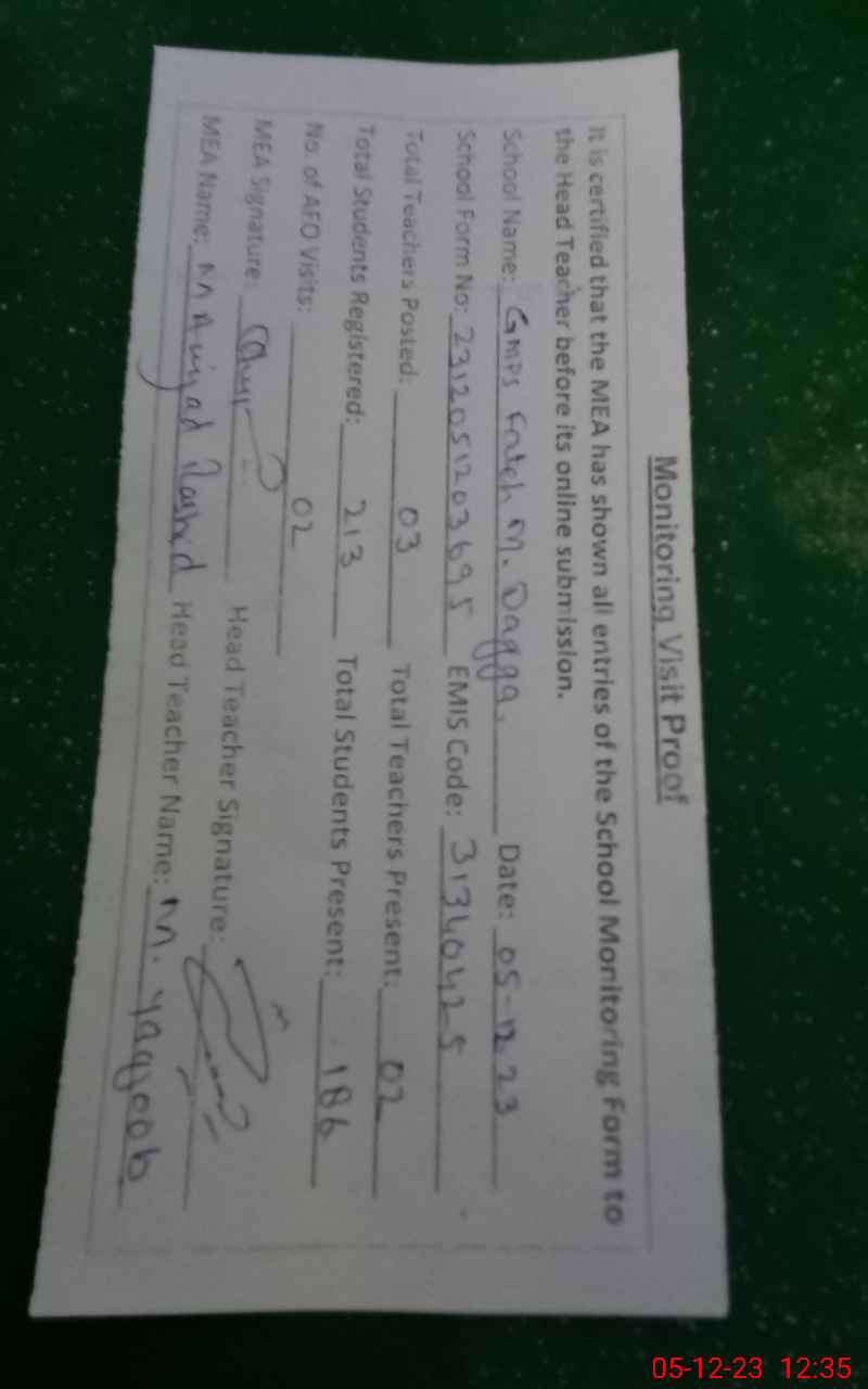 | EMIS Code: 31340425 | Name of School: GMPS FATEH MUHAMMAD DUGGA | |||